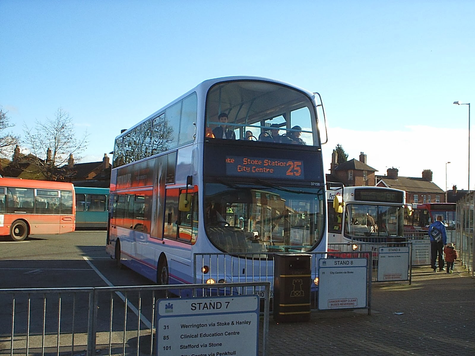 We got on the bus and we went upstairs. The bus was quite full so matthew sat with uncle Dave and I sat on my own a few seats away. The bus left Newcastle on the A53 and then onto George Street. The bus then headed though Hartsill. We headed into Stoke passing 37160 & 37156 on #25's. Having been buses that once did the very intense